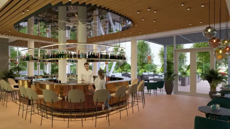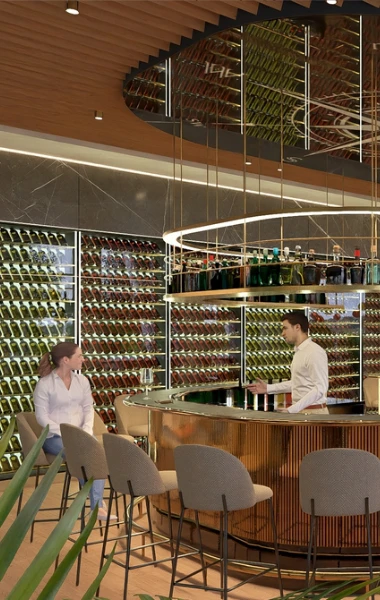 A Compass Bar a szálloda egyik legfontosabb találkozási pontja, közvetlen kapcsolatban a lobby terével és panorámás kilátással a kikötőre. A megérkezést követően gyakran ez az első állomás a vendégek számára, ahol lelassulnak, körbenéznek, és irányt vesznek a szállodán belüli élmények felé. A víz közelsége és a hajós hangulat természetes hátteret ad az itt eltöltött időnek, miközben az elegáns, átgondolt enteriőr nyugodt, elvonulásra is alkalmas atmoszférát teremt. Kényelmes, csendes sarkai ideálisak egy beszélgetéshez, egy italhoz vagy egy lassabb pillanathoz a nap folyamán.